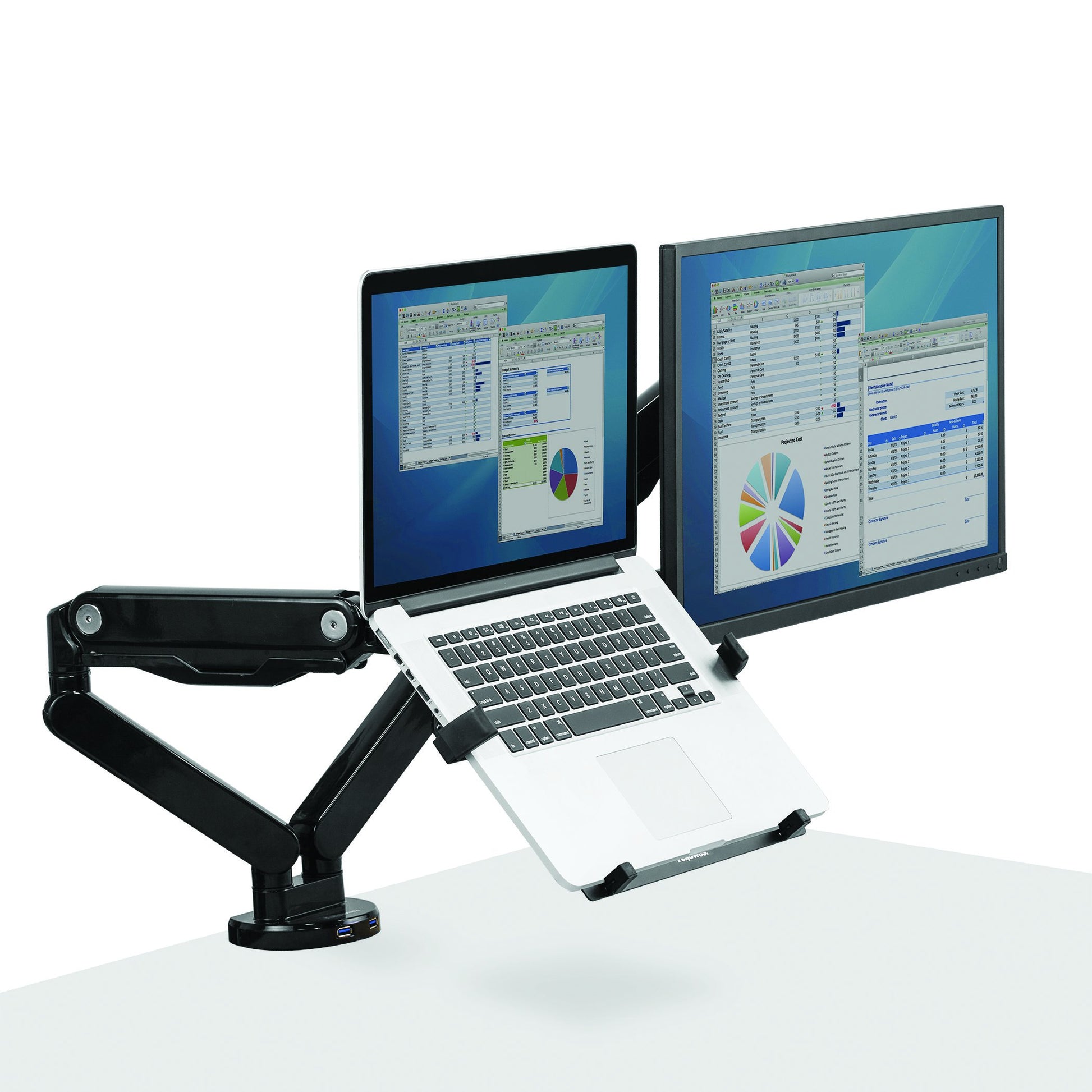 - Add the Fellowes® Monitor Arm Accessory - Laptop so you can use a screen and laptop next to one another